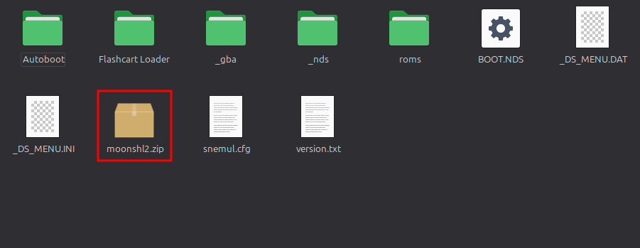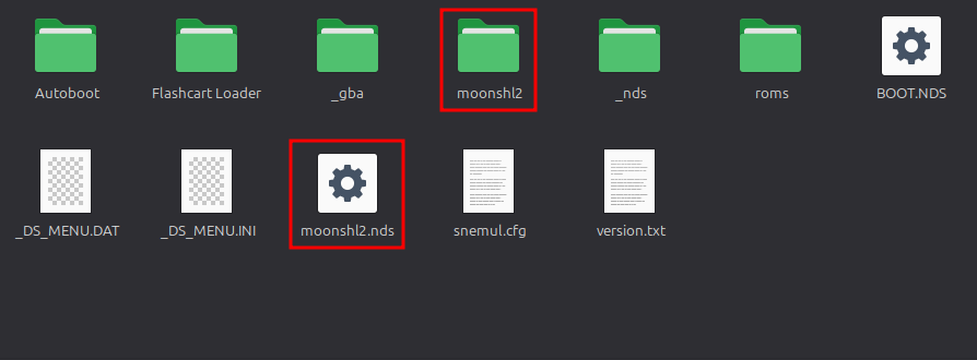 Ahora te debe de salir una carpeta llamada moonshl2 y un archivo llamado moonshl2.nds